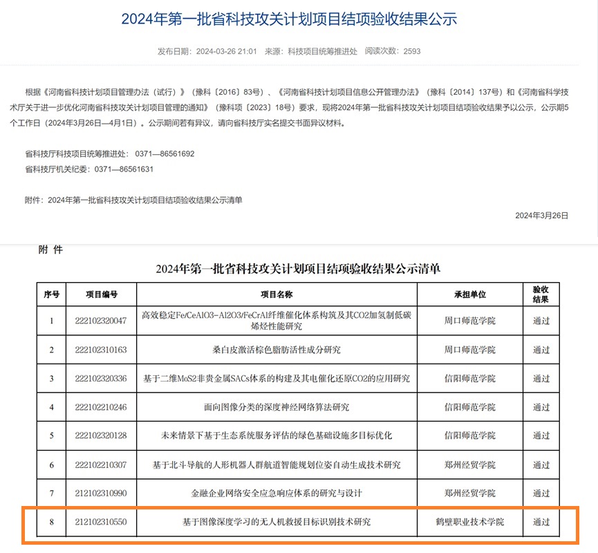 近日,从河南省科学技术厅获悉,公司betway西汉姆联教师徐超的河南省科技攻关计划项目《基于图像深度学习的无人机救援目标识别技术研究》(项目编号:212102310550)顺利通过验收结项。